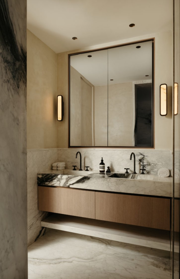 Natürliche Materialien wie Eichenholz, Travertinstein und handaufgetragene Kalkfarbe bilden das Fundament dieses warmen und texturreichen Raumes. Das Interieur wirkt modern und zeitlos zugleich, sorgfältig ausgewählt, um Ruhe und Präsenz zu fördern.