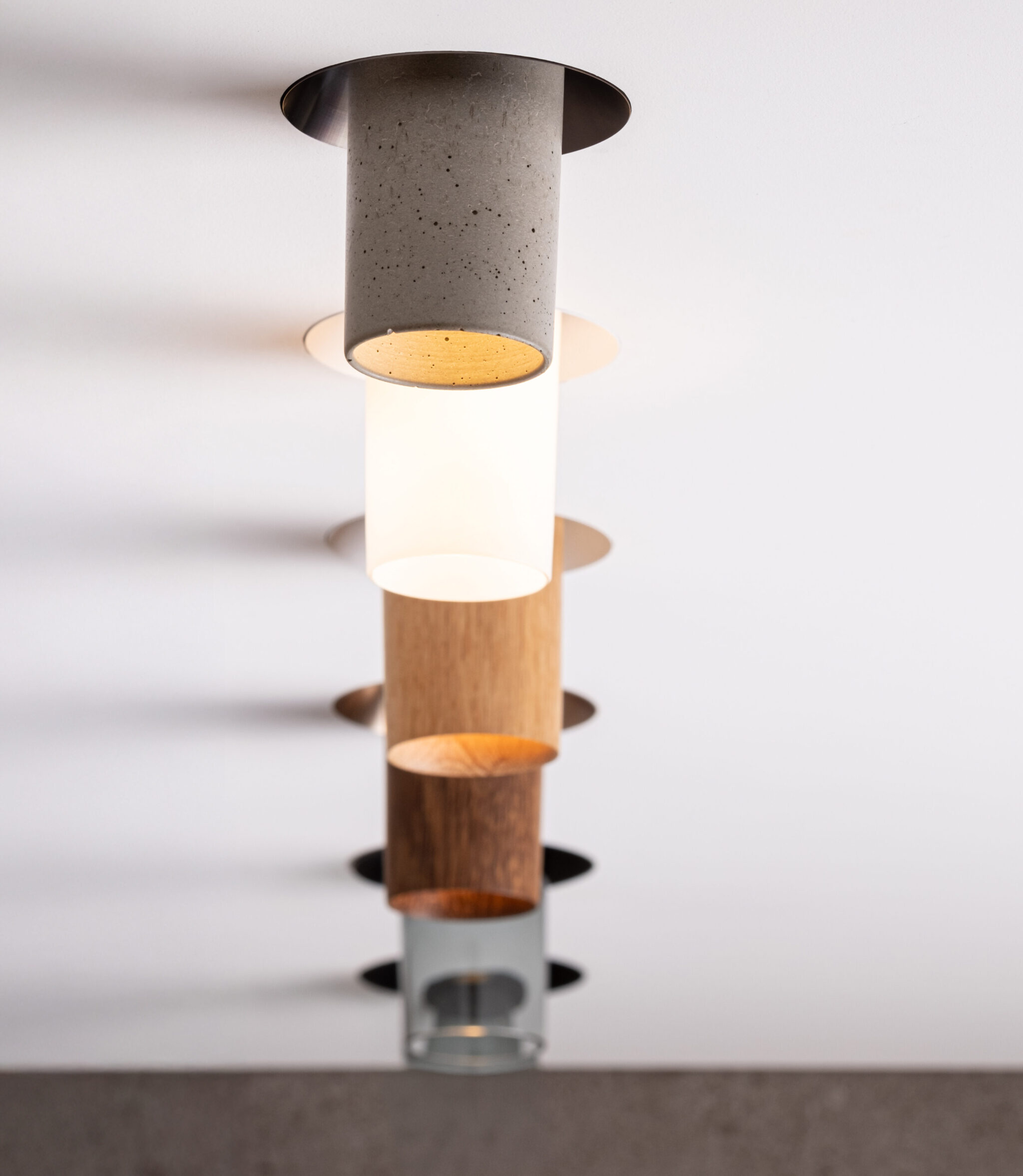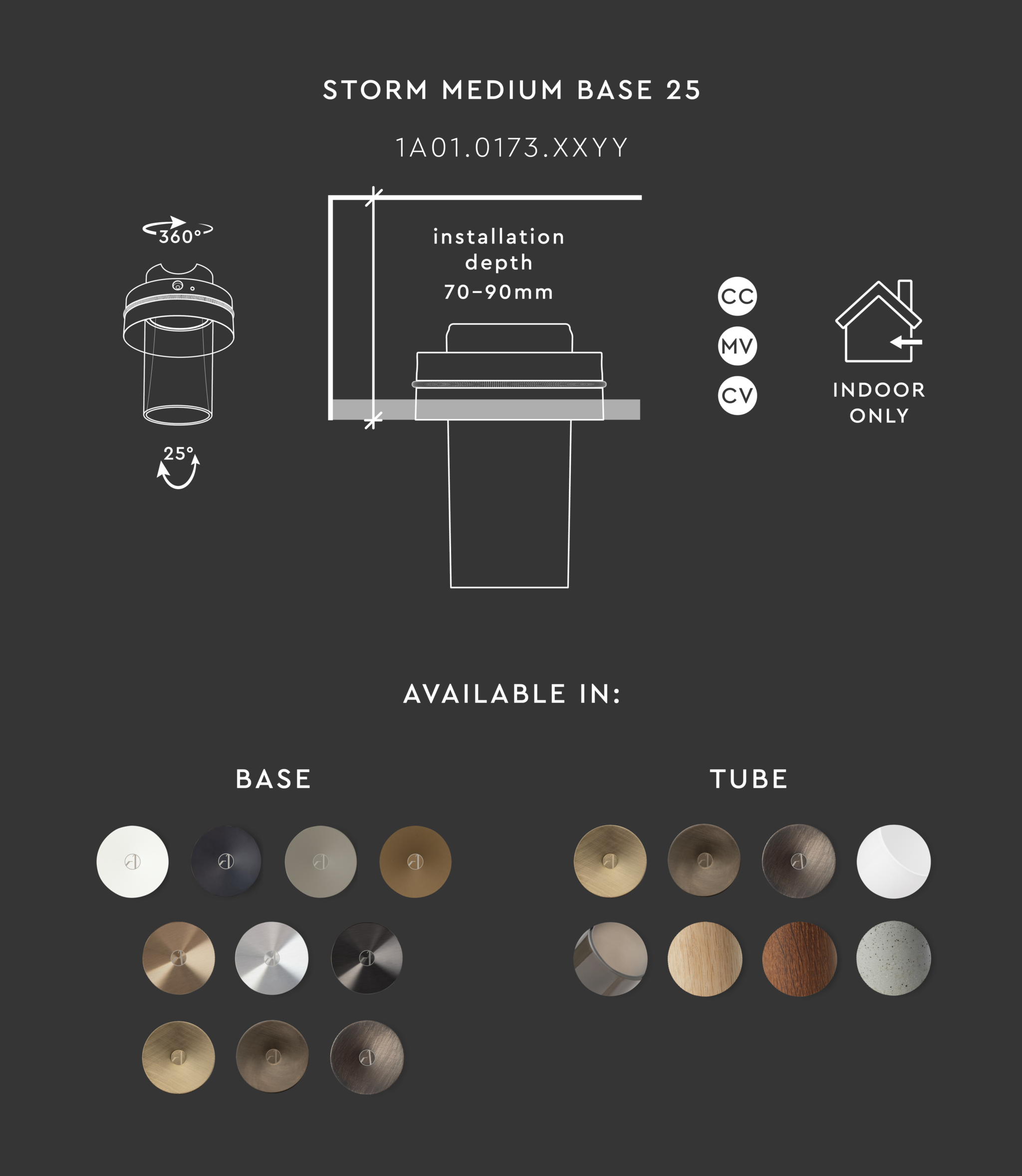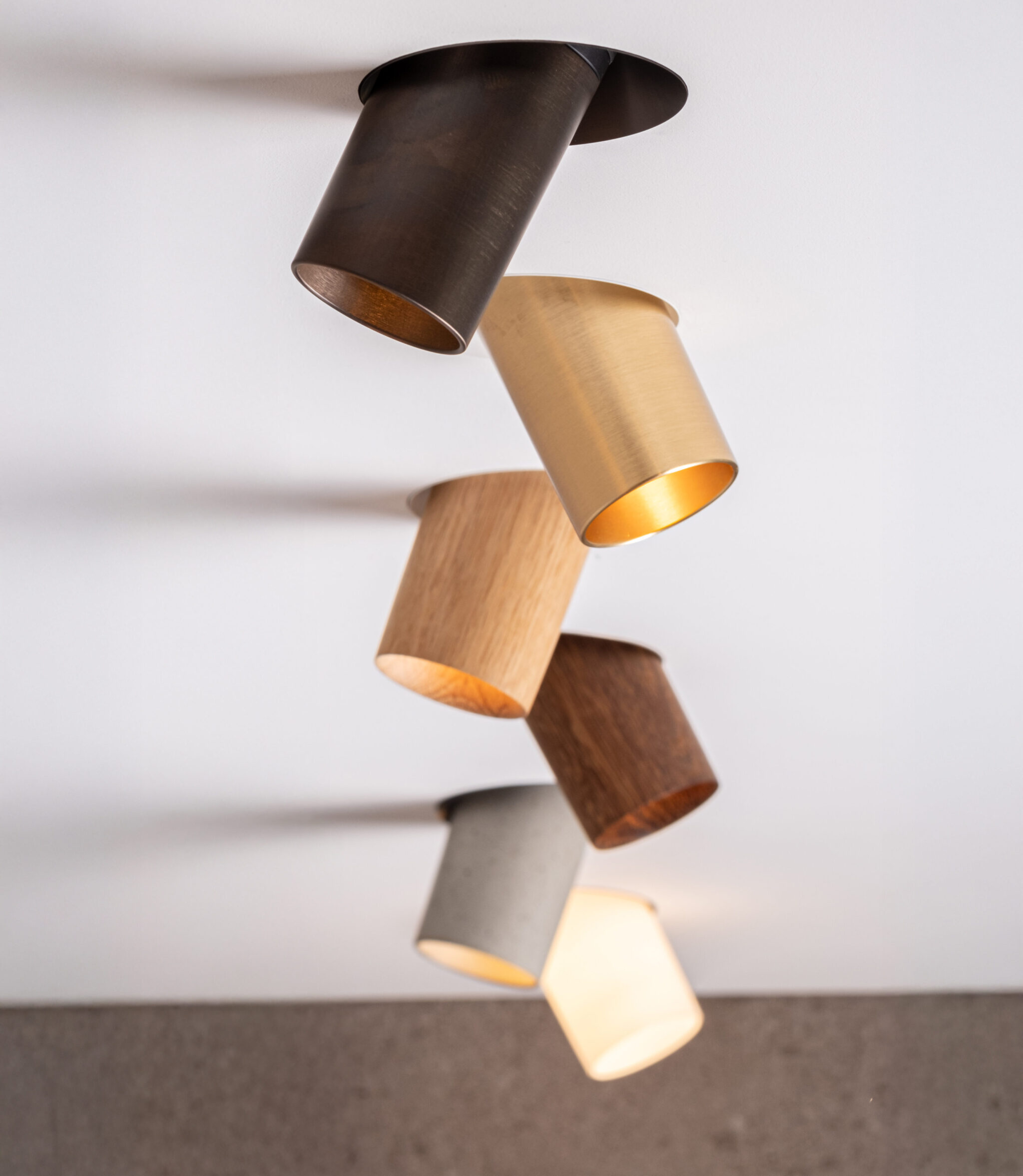 Die Leuchte ist um 360° drehbar und bietet eine 20°-Verstellung entlang der Längsachse. Basis und Rohre sind in verschiedenen Ausführungen und Materialien erhältlich.