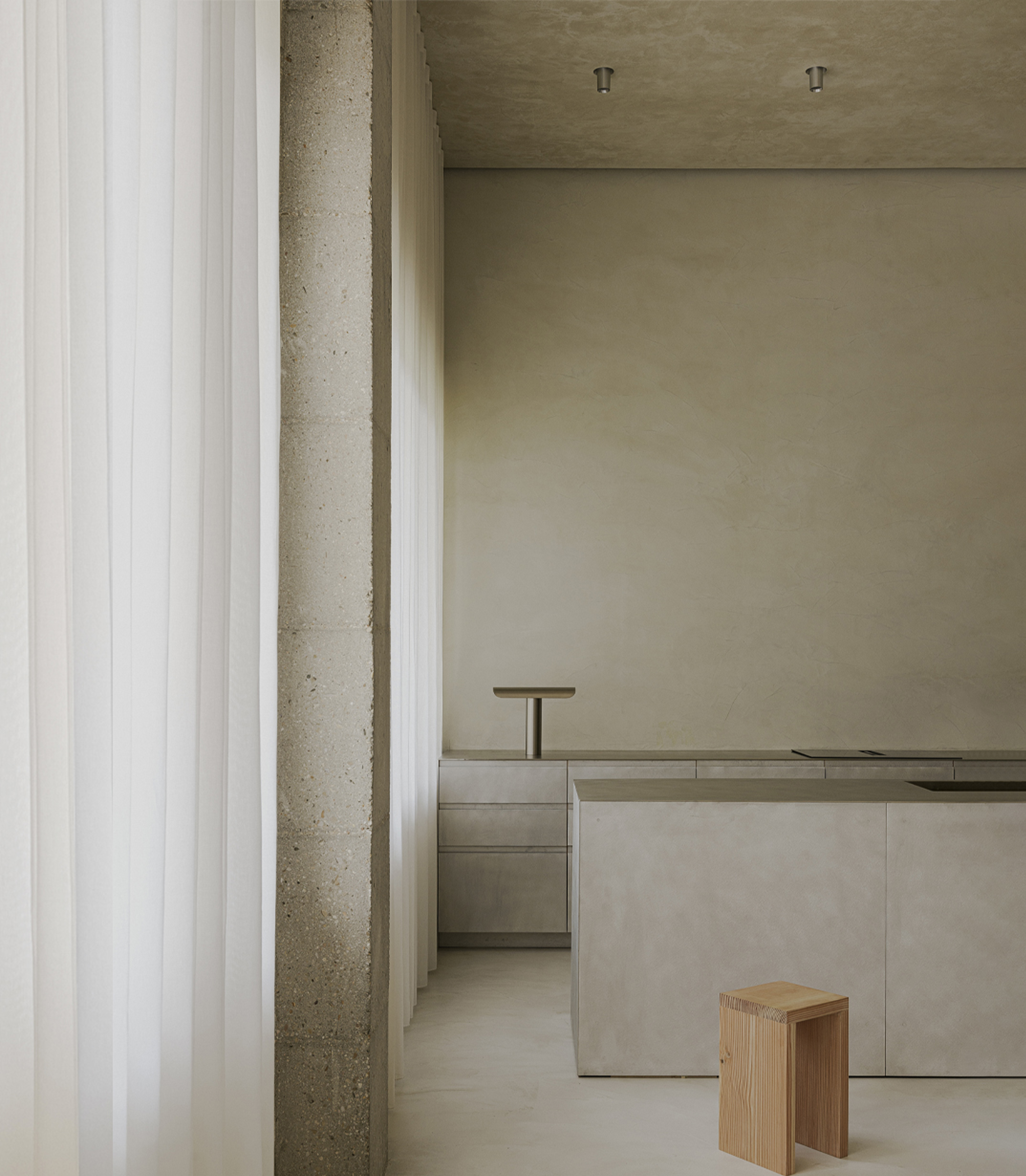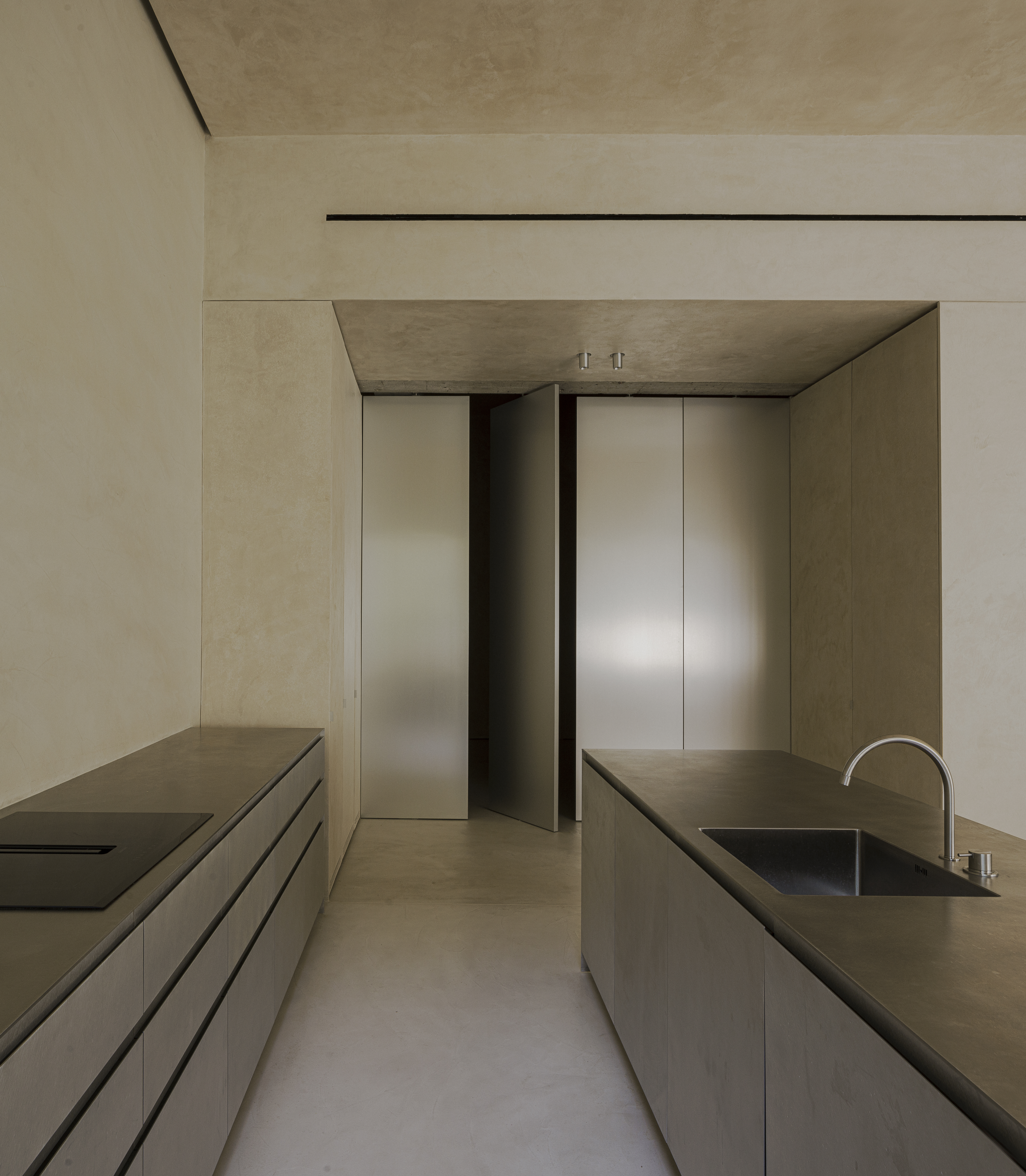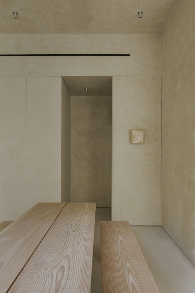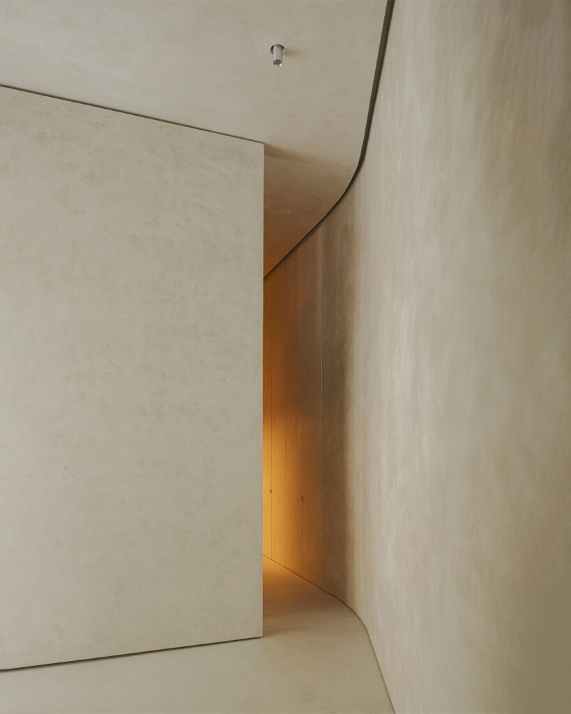 The interior of the home is monumental in scale, incorporating polished metal elements, artisanal textures, and minimalist furniture design in wood and stone. This helps create a refined atmosphere, with a warm, sculptural feel, generating a space that stands alone for its functionality as well as its unique aesthetics