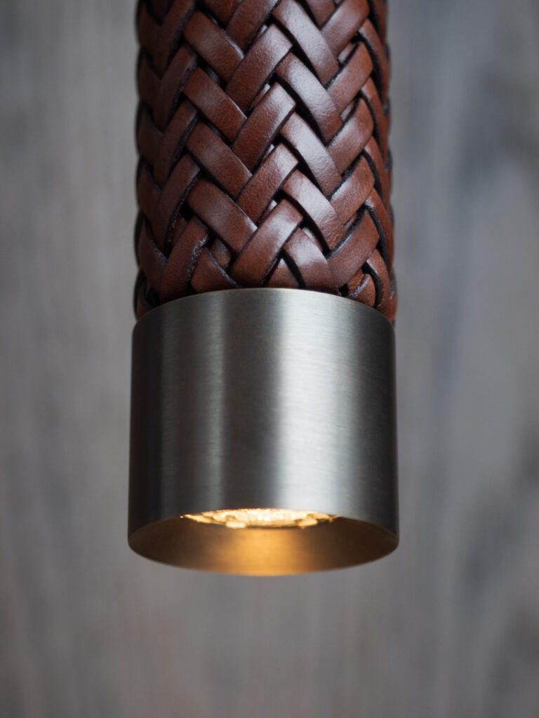 | Carefully integrated into the vertical stem of selected luminaires, braided leather invites a tactile experience that feels as intentional as it looks – adding warmth, contrast, and artisanal refinement to sculptural forms. |