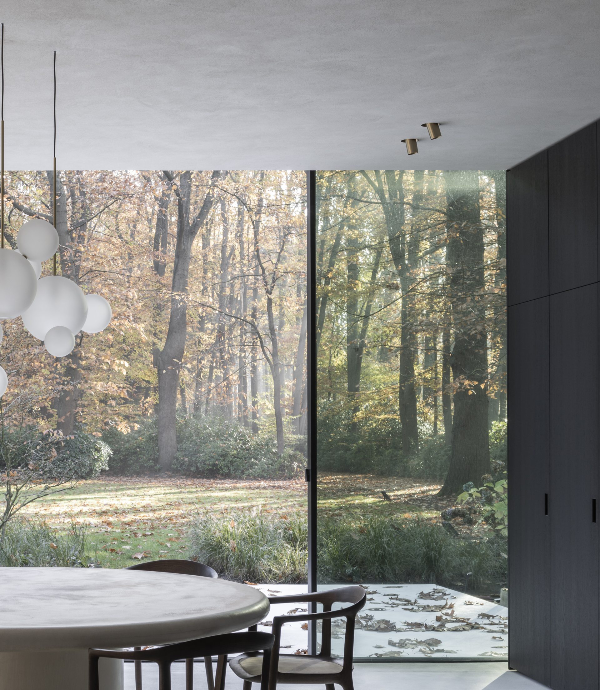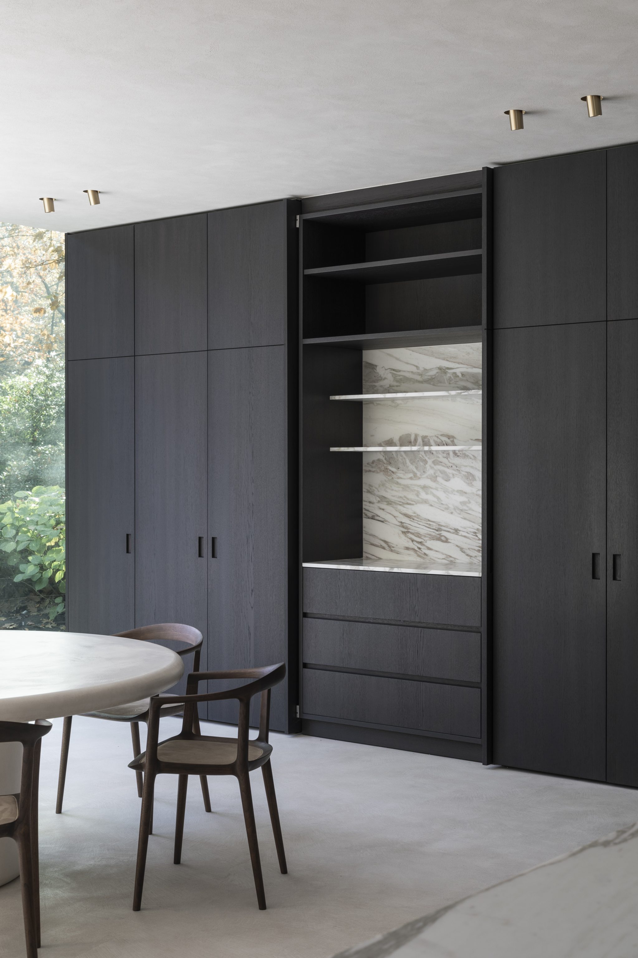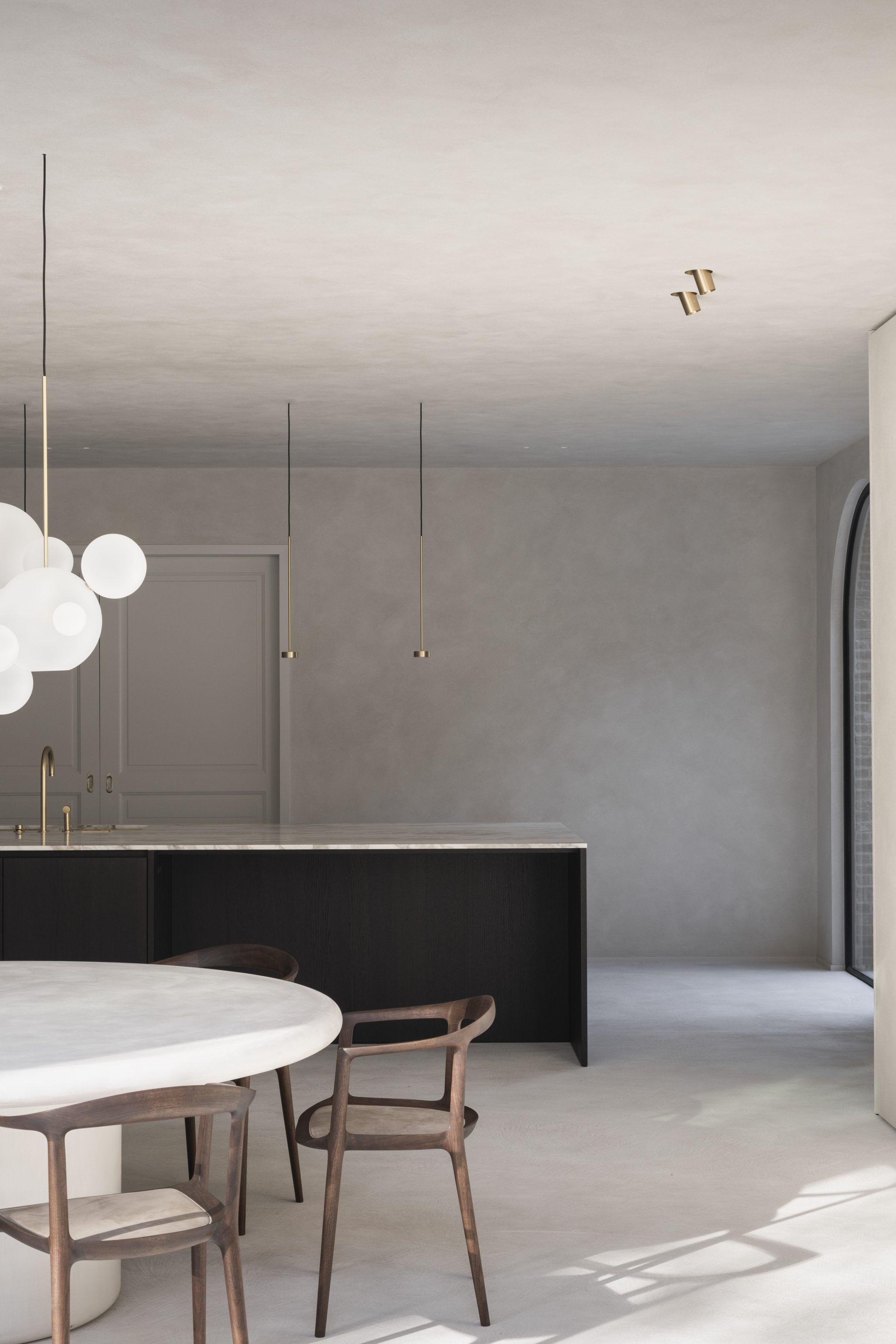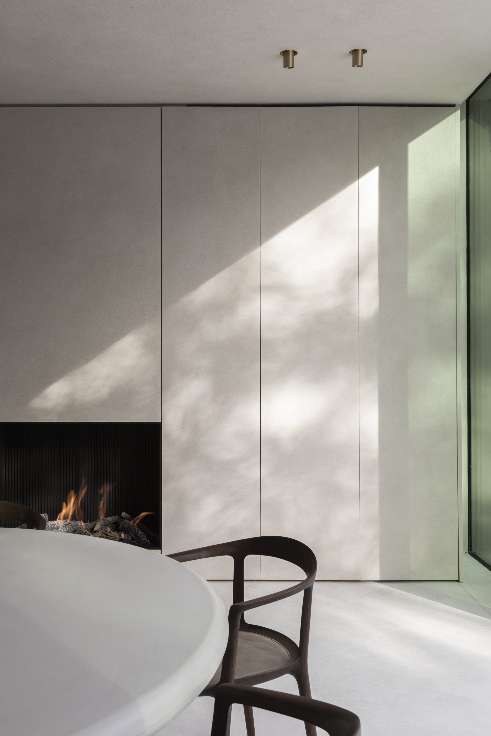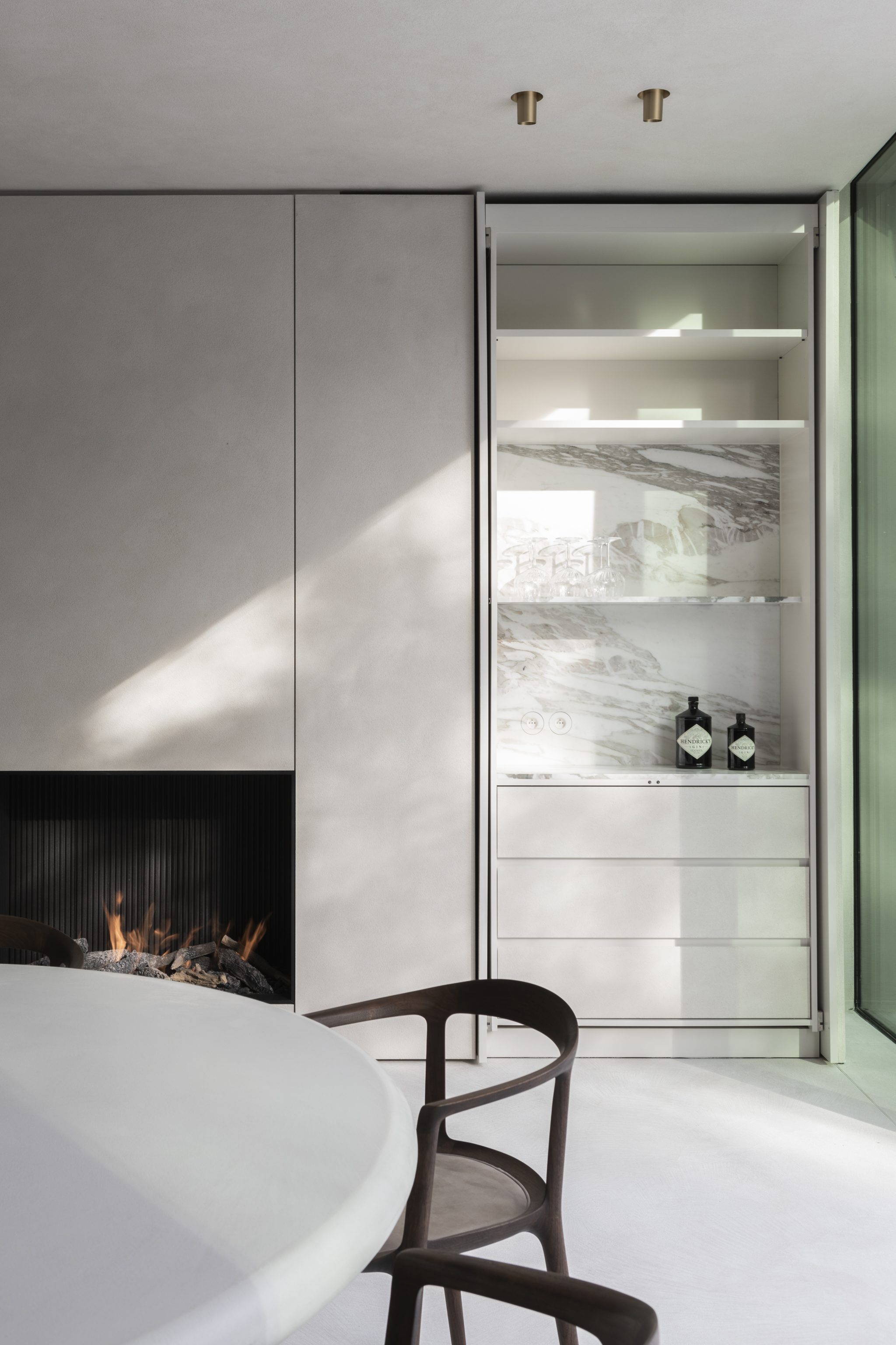 The kitchen offers a complete overview of the space. With great skills and strategically placement of the cabinets, the space was purified and reduced to its essence. The color and material palette have been fully coordinated with the clients and their love for the coast, while the round dinning table and the fireplace provide a cosiness. It turned out to be the perfect place where the family can gather after a busy day.