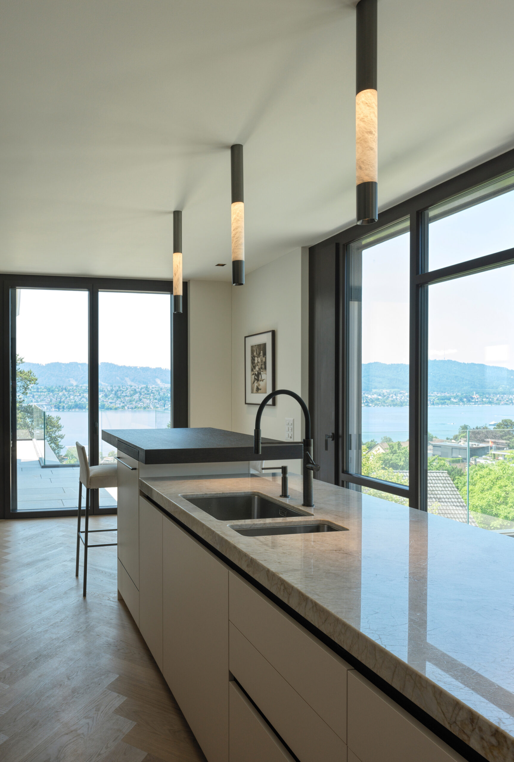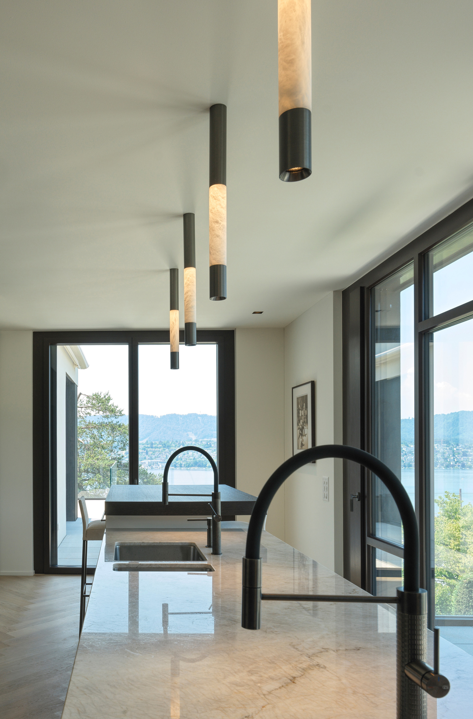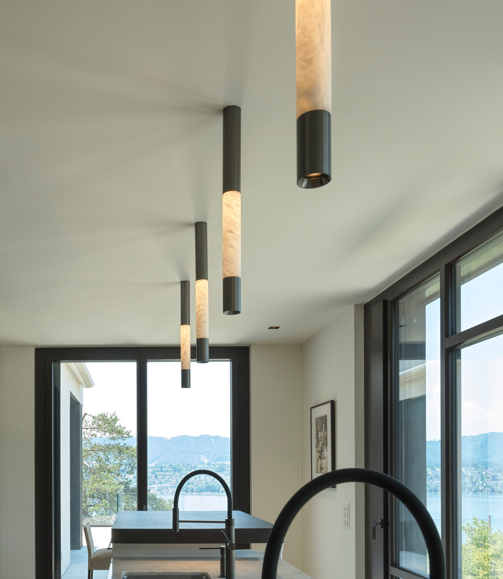 As a key element of the kitchen design, Orea has incorporated the Alubaster Direct surface-mounted fixture by ONE A. The lamp not only emanates a warm and inviting glow through its alabaster material but also provides focused task lighting with its bottom fixture. The Alubaster Direct seamlessly combines aesthetic beauty and practical functionality, enhancing the ambience of the kitchen space.