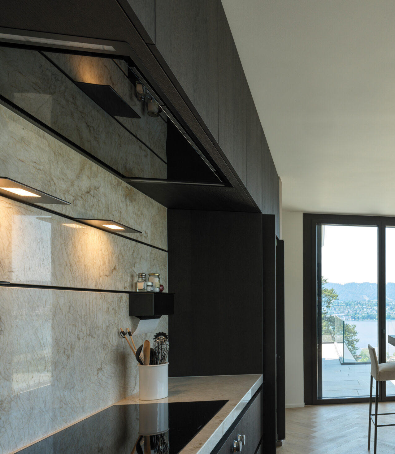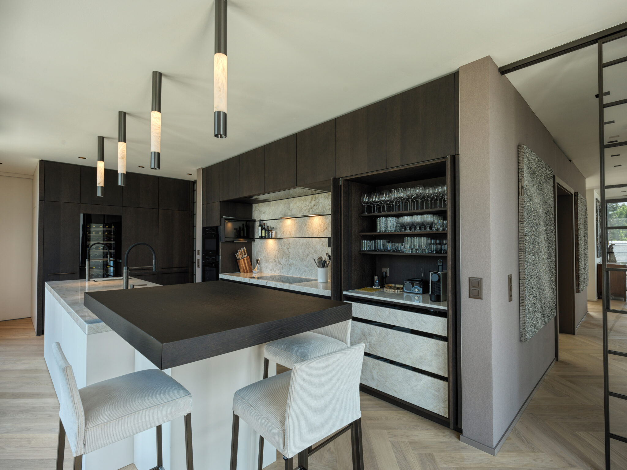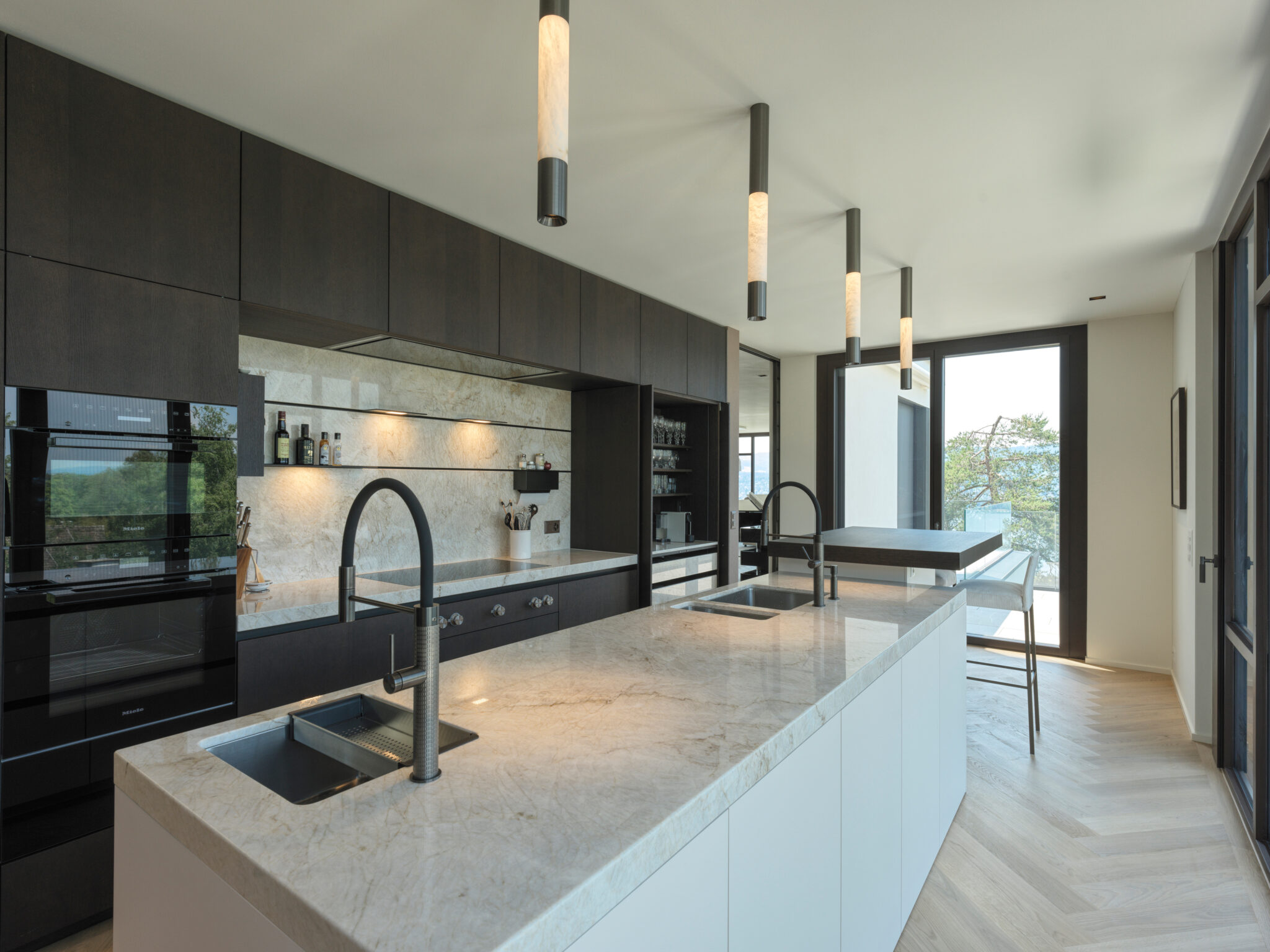As a key element of the kitchen design, Orea has incorporated the Alubaster Direct surface-mounted fixture by ONE A. The lamp not only emanates a warm and inviting glow through its alabaster material but also provides focused task lighting with its bottom fixture. The Alubaster Direct seamlessly combines aesthetic beauty and practical functionality, enhancing the ambience of the kitchen space.