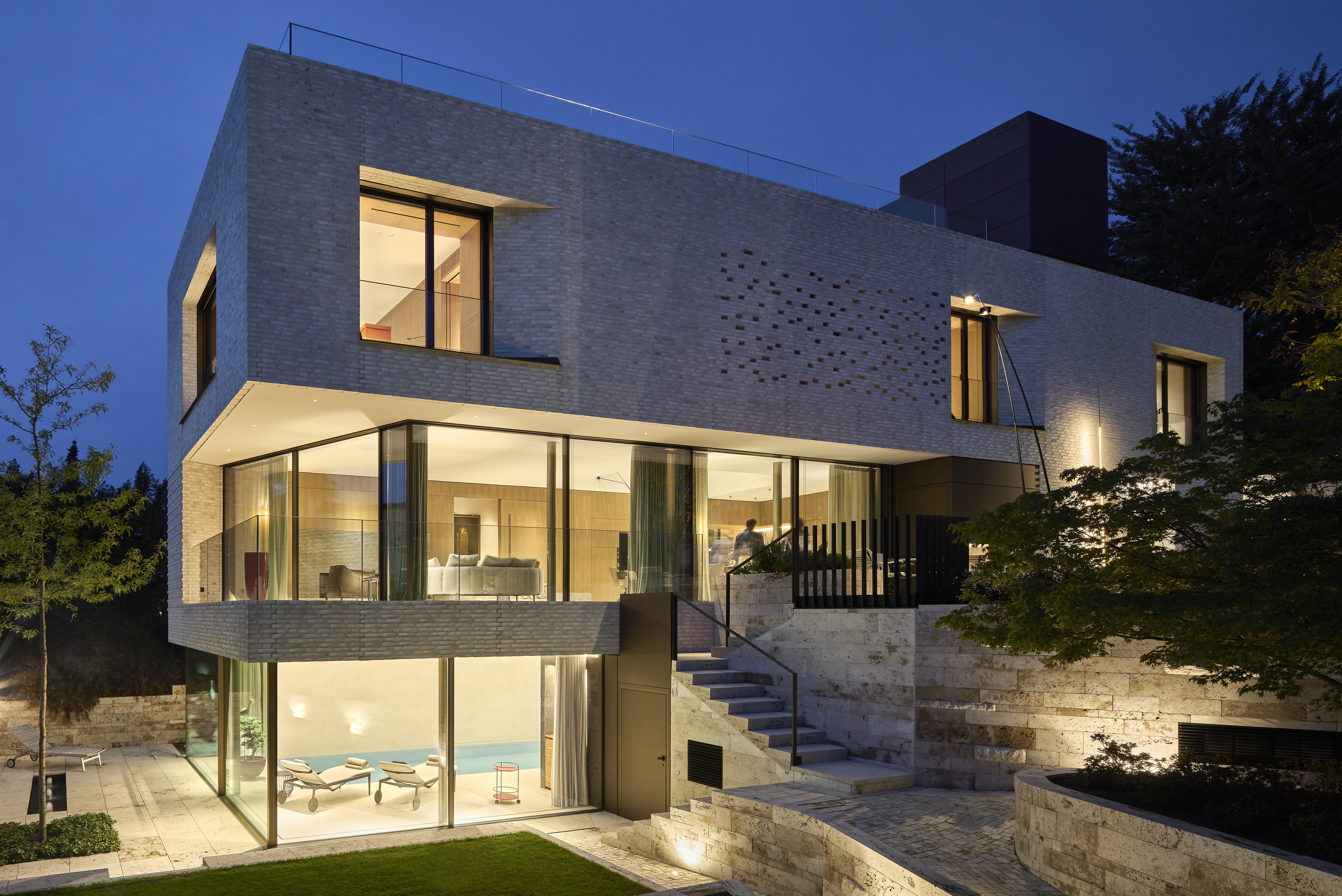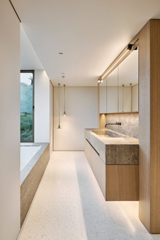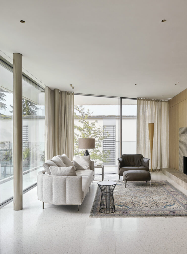 The new villa on a hillside presents itself in modern, understated elegance. Holzrausch worked closely with the Kleinert and Partner architectural firm and the client for the interior design. The material and colour concept responds to the facade and the outside space – for example with natural stone and light earth tones. The open-pored lime plaster, the high-quality floor made of terrazzo tiles and the precisely jointed panels made of steamed oak together with the Wachenzeller dolomite on the fireplace and kitchen create a natural atmosphere.