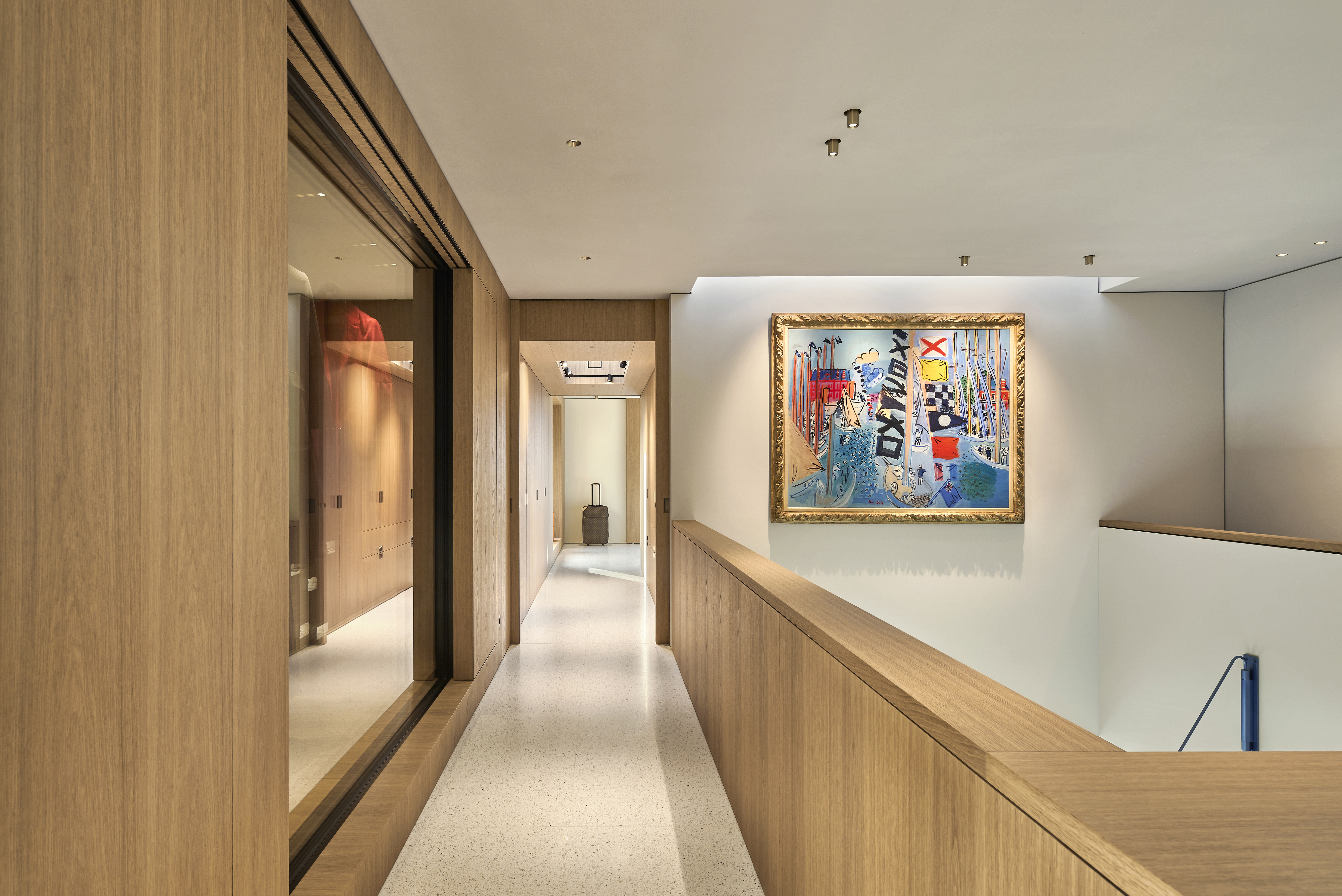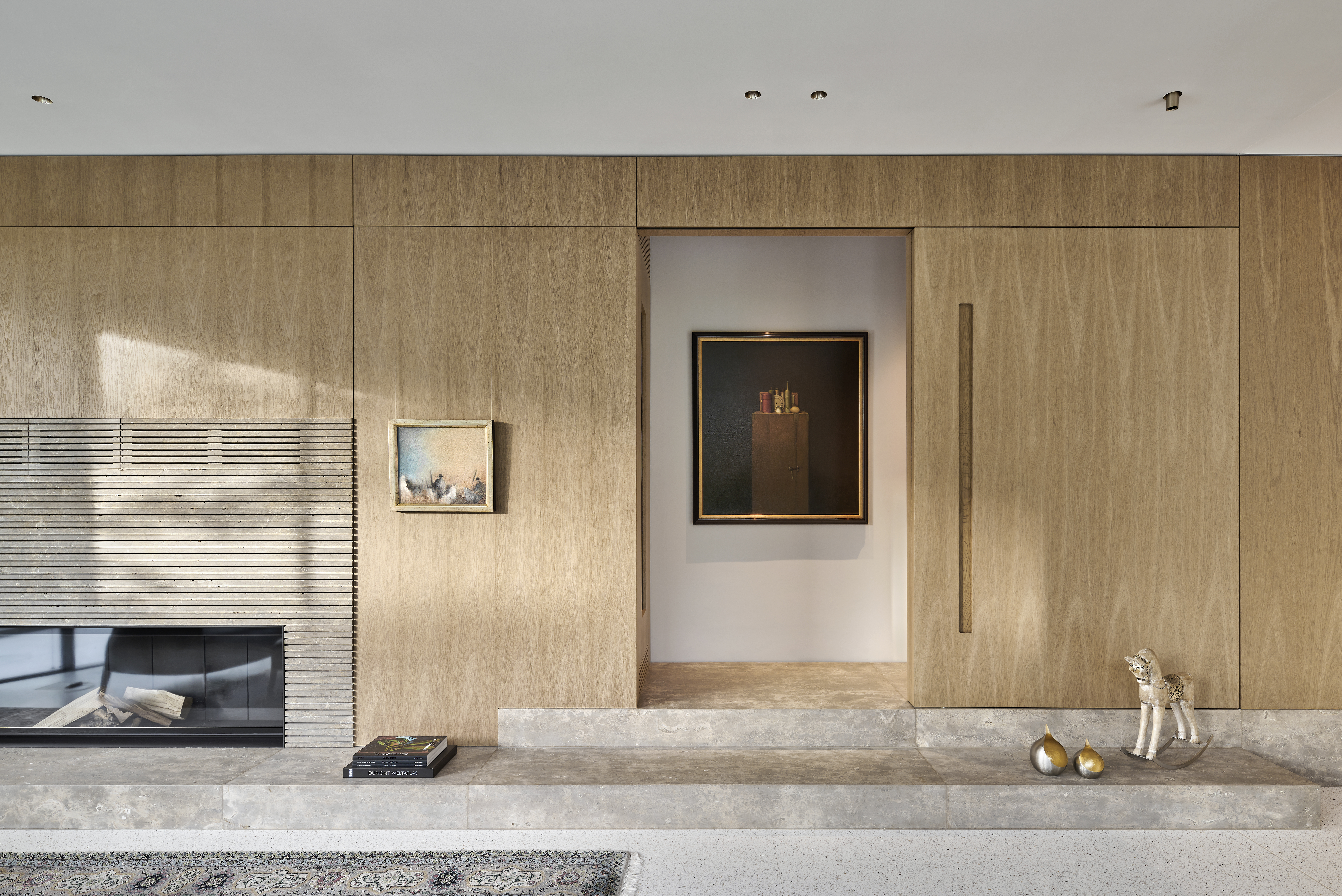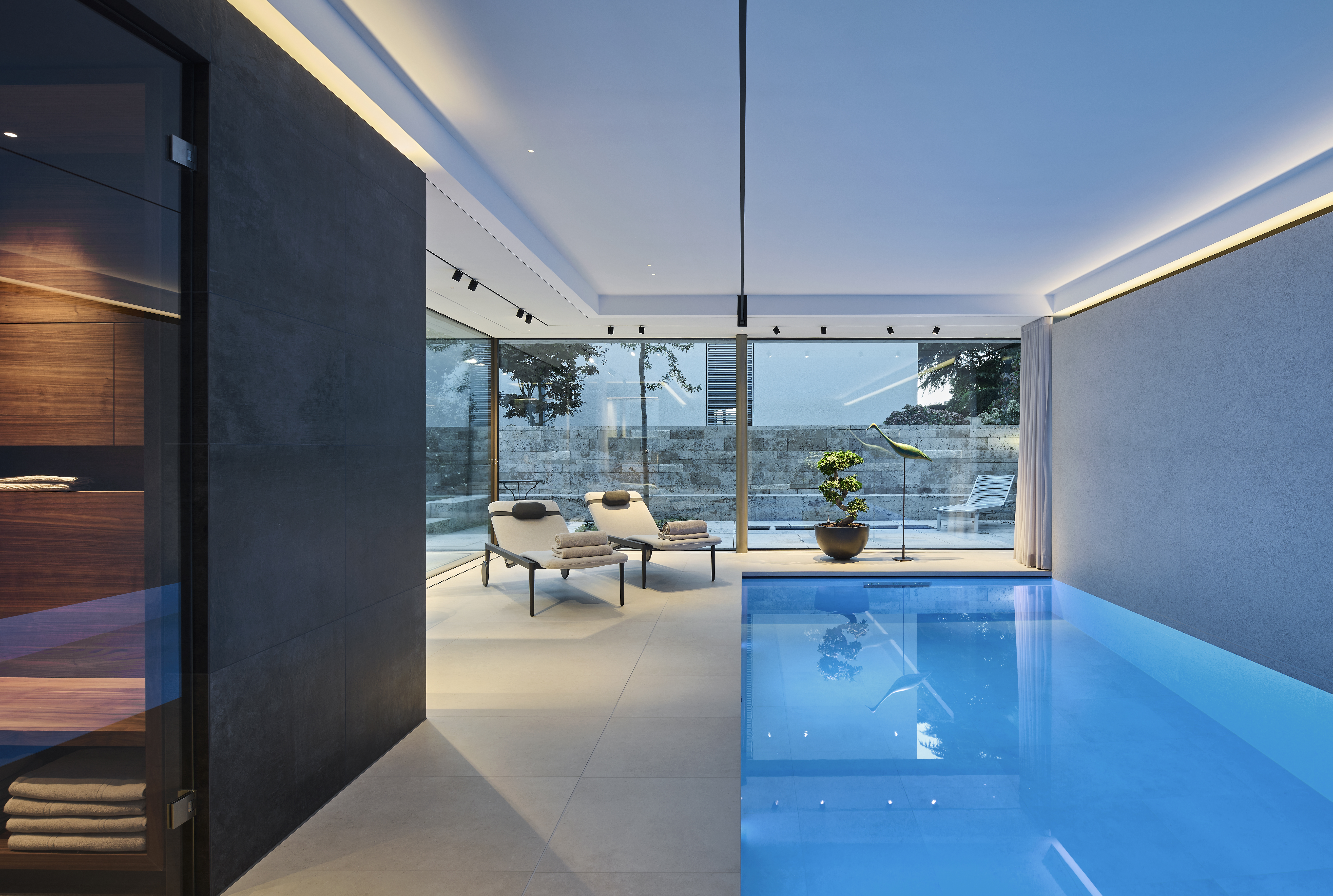 The new villa on a hillside presents itself in modern, understated elegance. Holzrausch worked closely with the Kleinert and Partner architectural firm and the client for the interior design. The material and colour concept responds to the facade and the outside space – for example with natural stone and light earth tones. The open-pored lime plaster, the high-quality floor made of terrazzo tiles and the precisely jointed panels made of steamed oak together with the Wachenzeller dolomite on the fireplace and kitchen create a natural atmosphere.