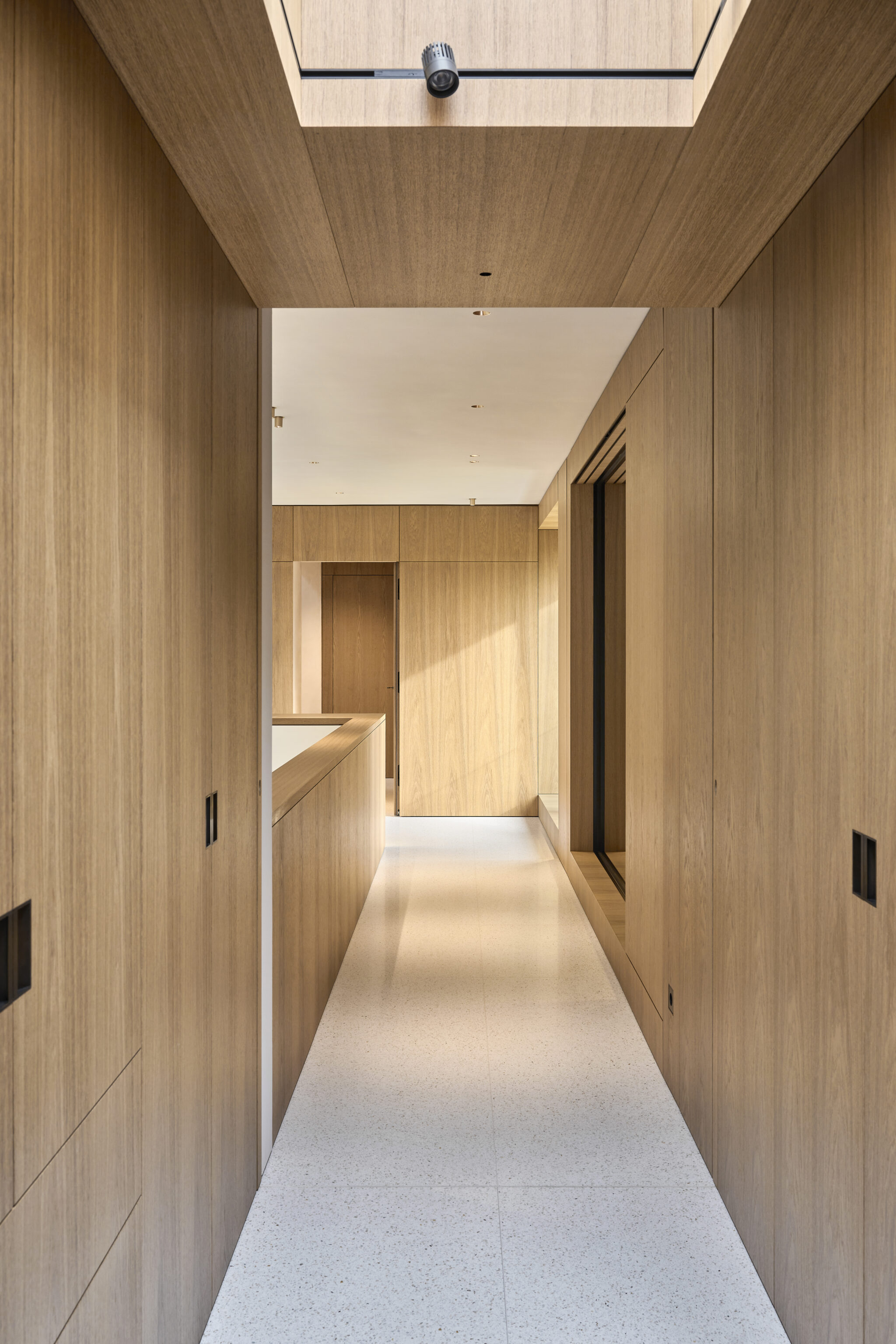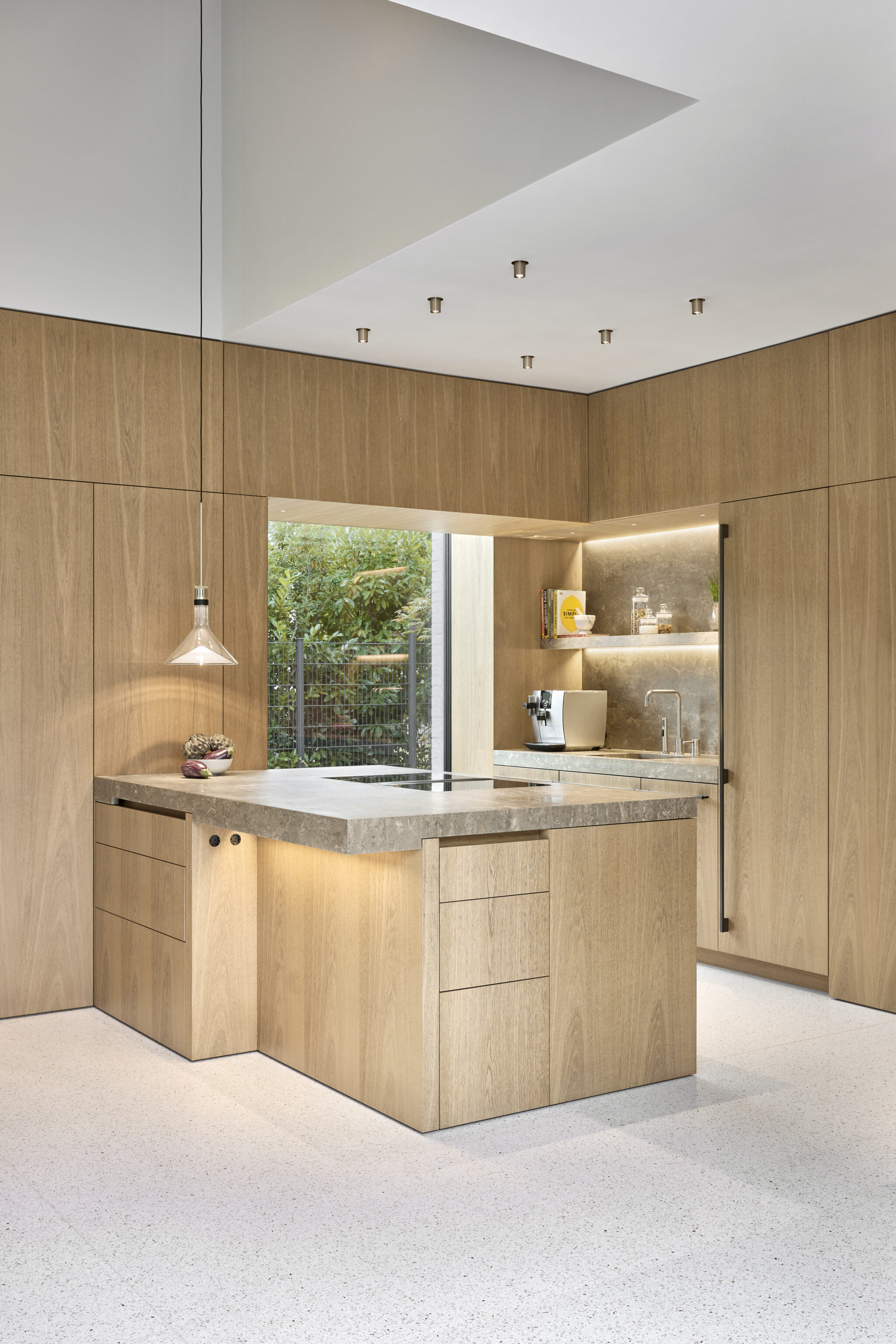 The wooden fittings combine with the architecture and take on functions such as the internal staircase or the elevator. The ground floor is bright and inviting: in the light-flooded living room with dining area and open kitchen, the oak wall forms a calm counterpoint to the band of windows with a view of the garden.
