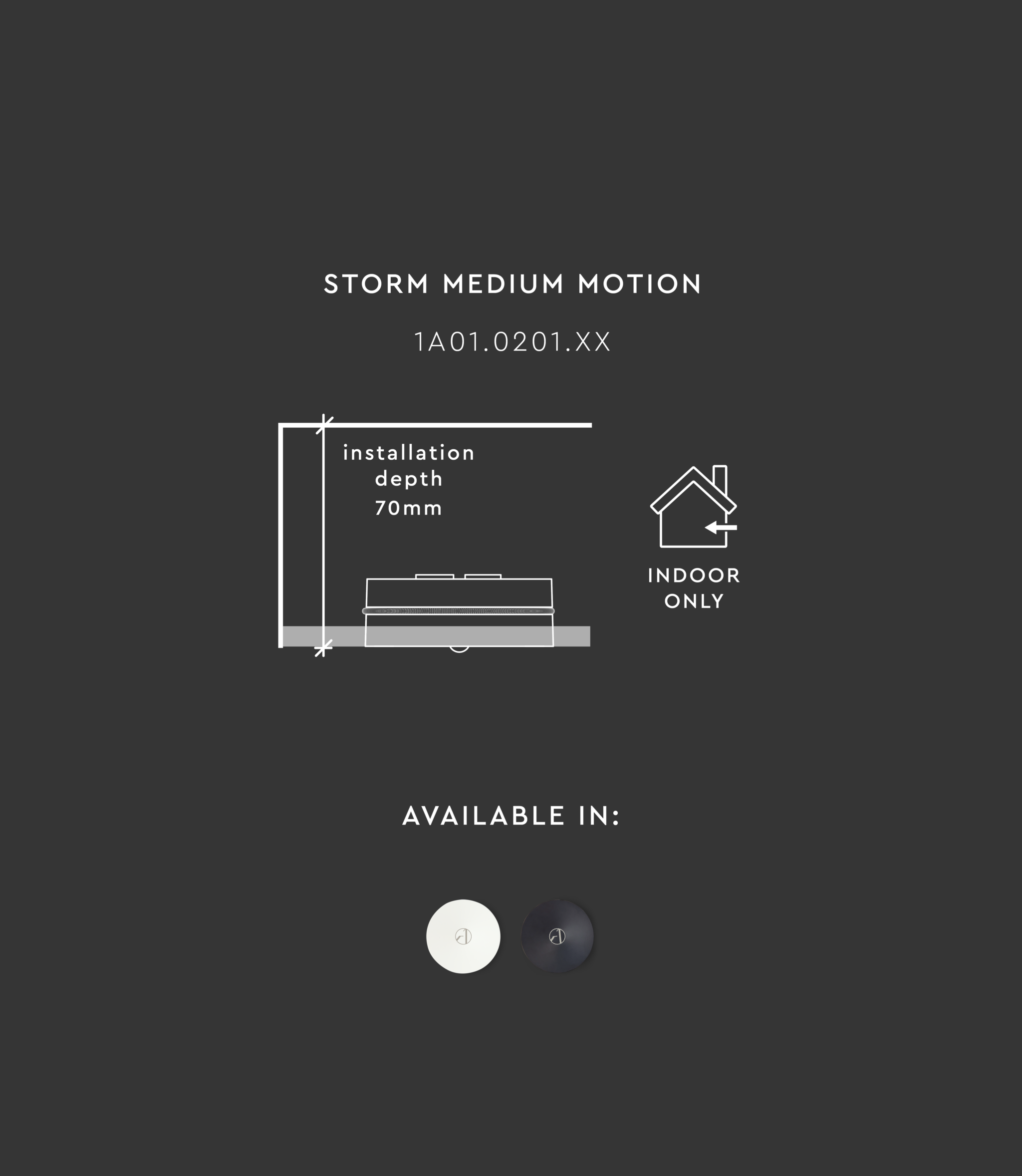 Storm Medium Motion is a fixture which in combination with a Storm Medium Motion Kit will provide a motion detector. Available sensors; 230V Master, 230V Slave, KNX, KNX/Temp, Dali SYS and DALI BMS.
