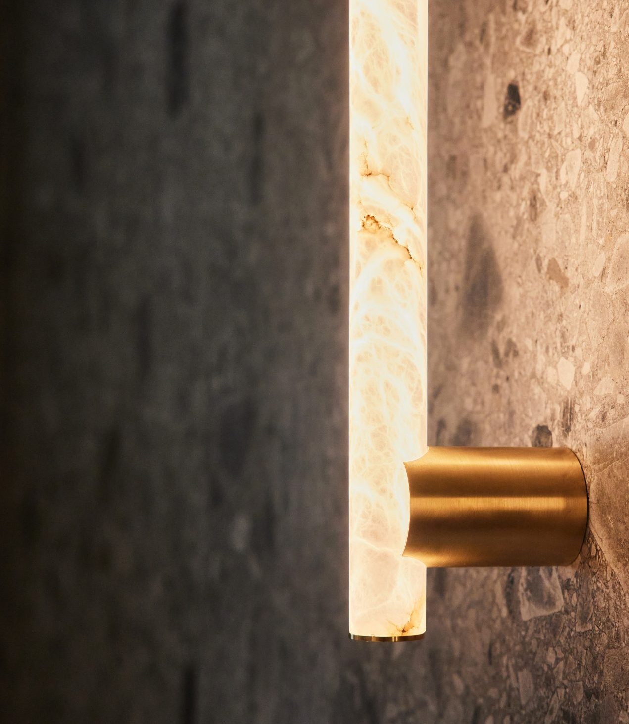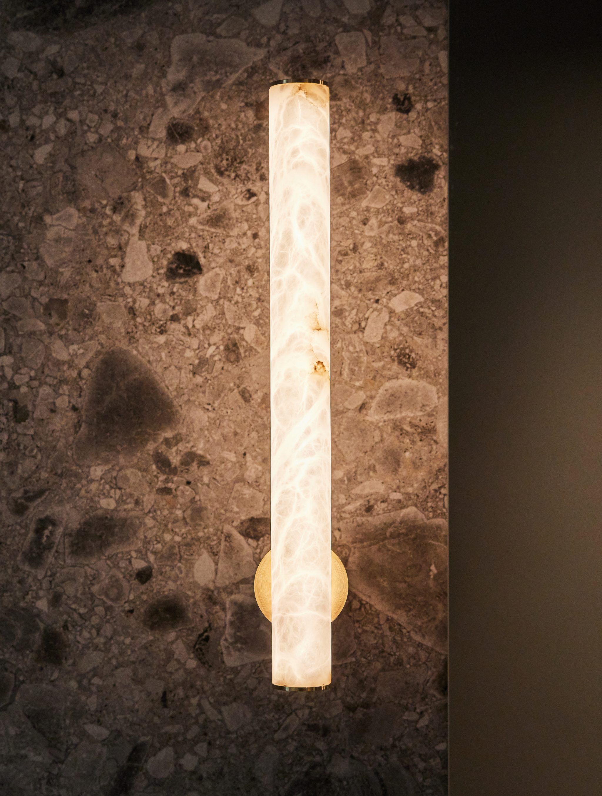 AW400L is a wall-mounted lamp that measures 400 mm in length. LEDs inside the alabaster tube, ensures that a homogeneous and continuous light is emitted throughout the stone.