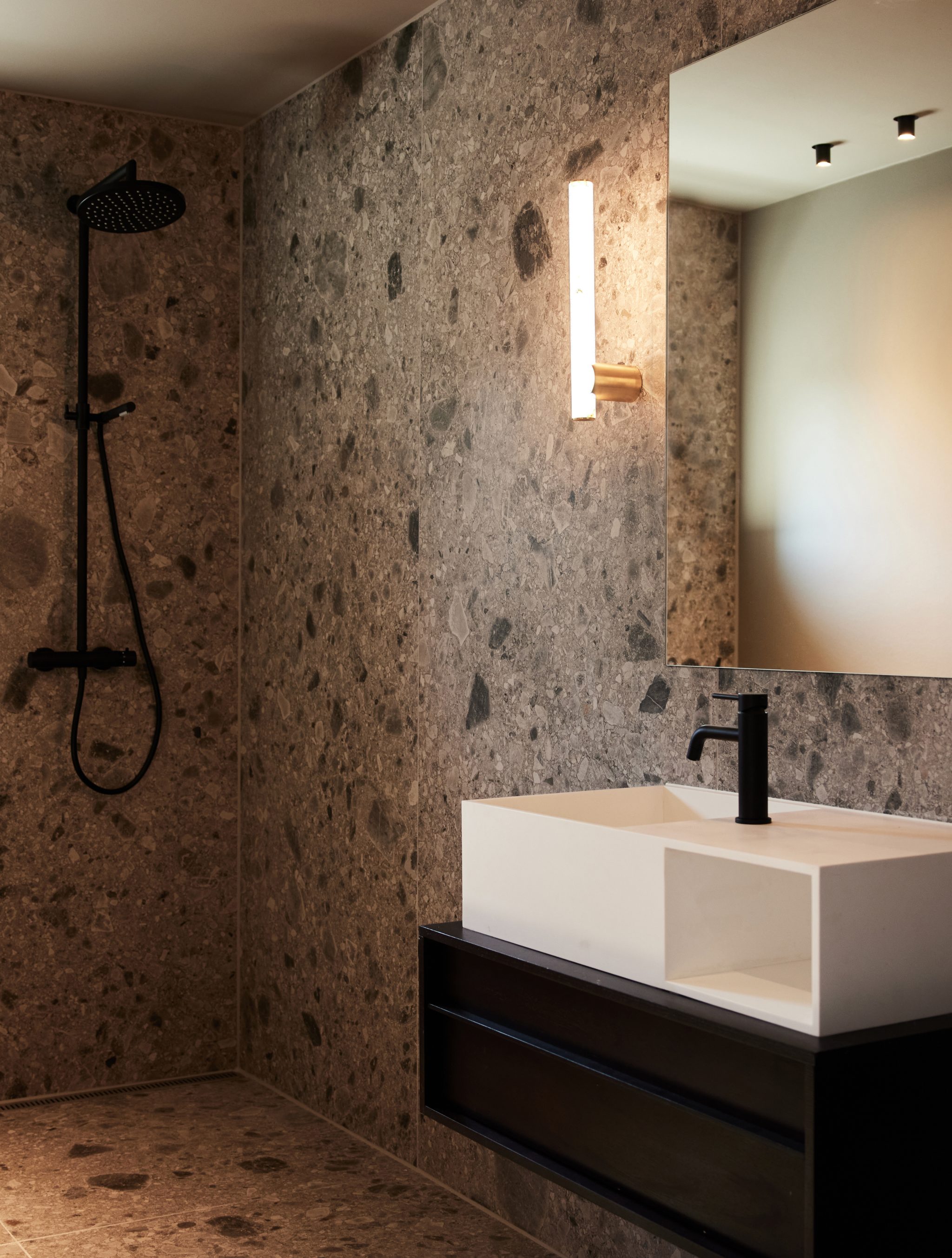 The tube has been finely polished resulting in a silky soft surface that enhances the unique marble structure of the natural stone. We have removed any disturbing elements from the meeting between the two materials, resulting in a streamlined and unique lamp that seems as if to float.